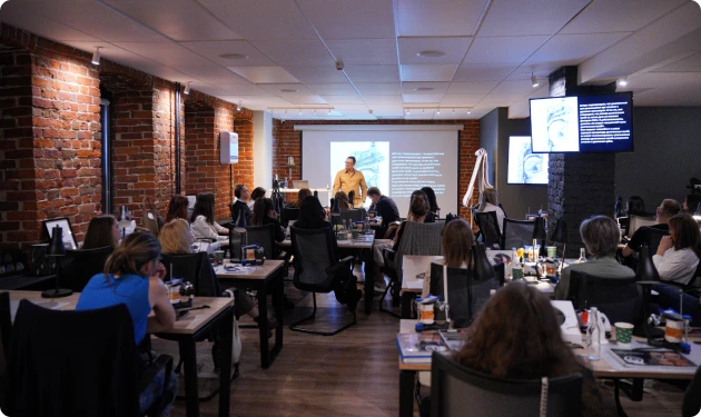 Чтобы отвлечься от учебного процесса и комфортно провести кофе-брейки, обеды или просто пообщаться с коллегами, в нашем здании есть собственное кафе в стиле лофт. Приятная атмосфера, стильный дизайн и всё, что необходимо для уютного времяпрепровождения.